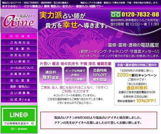 | 料金価格(電話) | 260円~/1分 ※鑑定士によって異なる場合アリ |